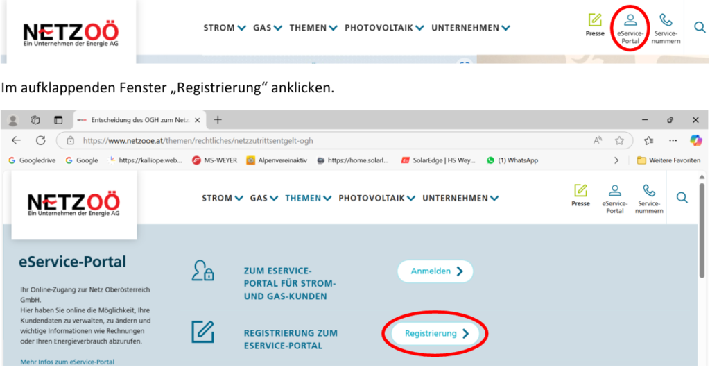 Sollten Sie bereits einen Zugang zum eService-Portal der Netz OÖ haben, können Sie den folgenden Punkt „1. Registrierung“ in dieser Anleitung überspringen und bei „2. Anmeldung“ fortsetzen.