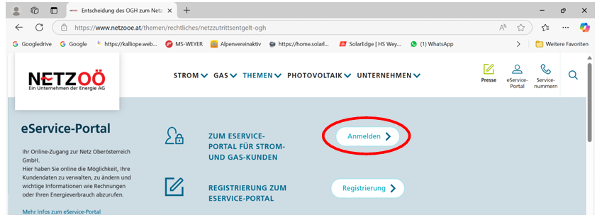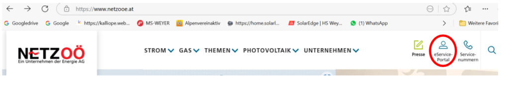 Geben Sie im Browser Ihres Computers die Internetadresse https://www.netzooe.at ein und klicken Sie dann auf das Symbol eService-Portal. (In folgender Abbildung rot eingekreist)