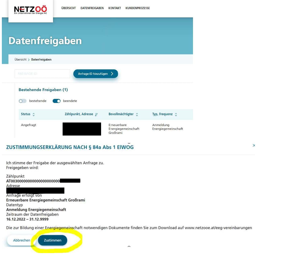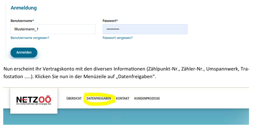 Damit Ihr monatlicher Strombezug bzw. Ihre ev. monatliche Einspeisung von der EEG-Ennstal abgerechnet werden können, benötigen wir von Ihnen die Datenfreigabe bei der Netz OÖ.